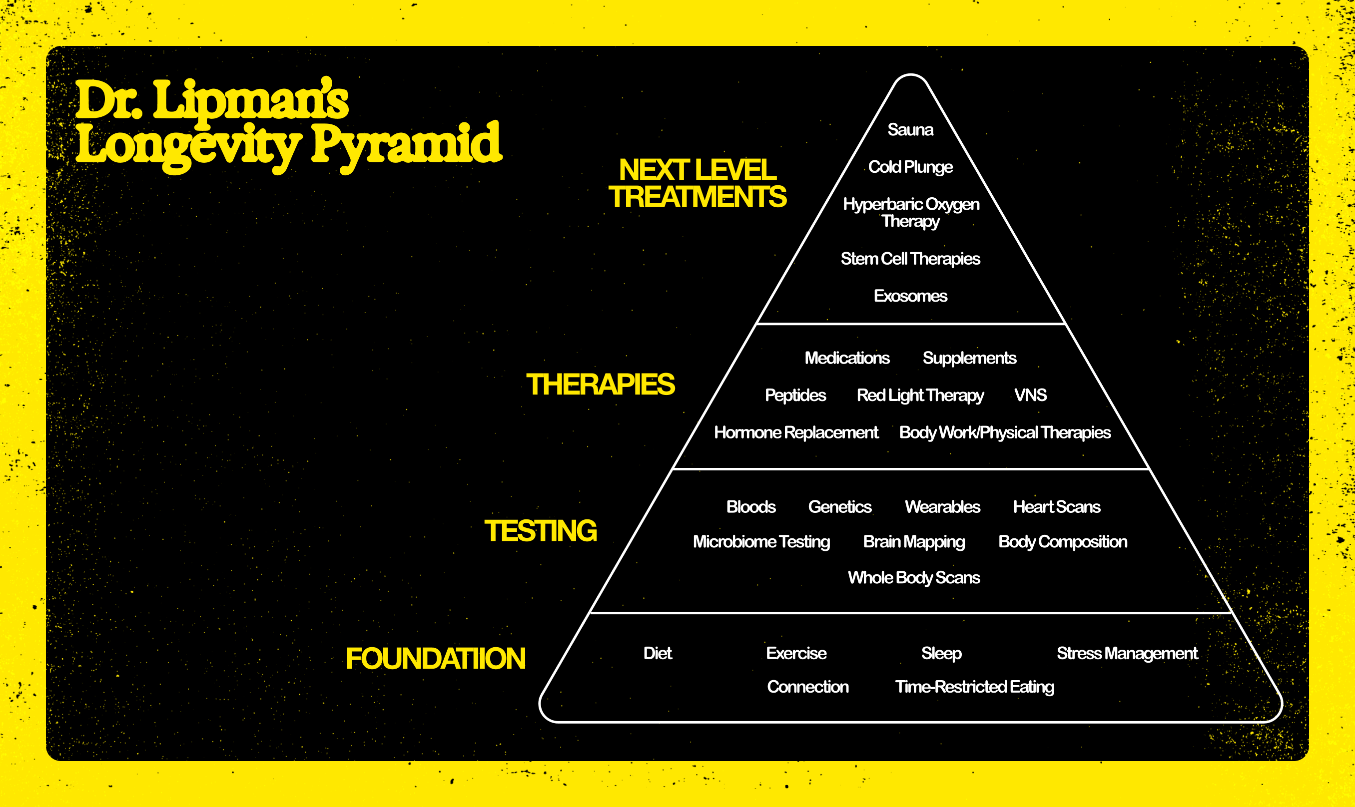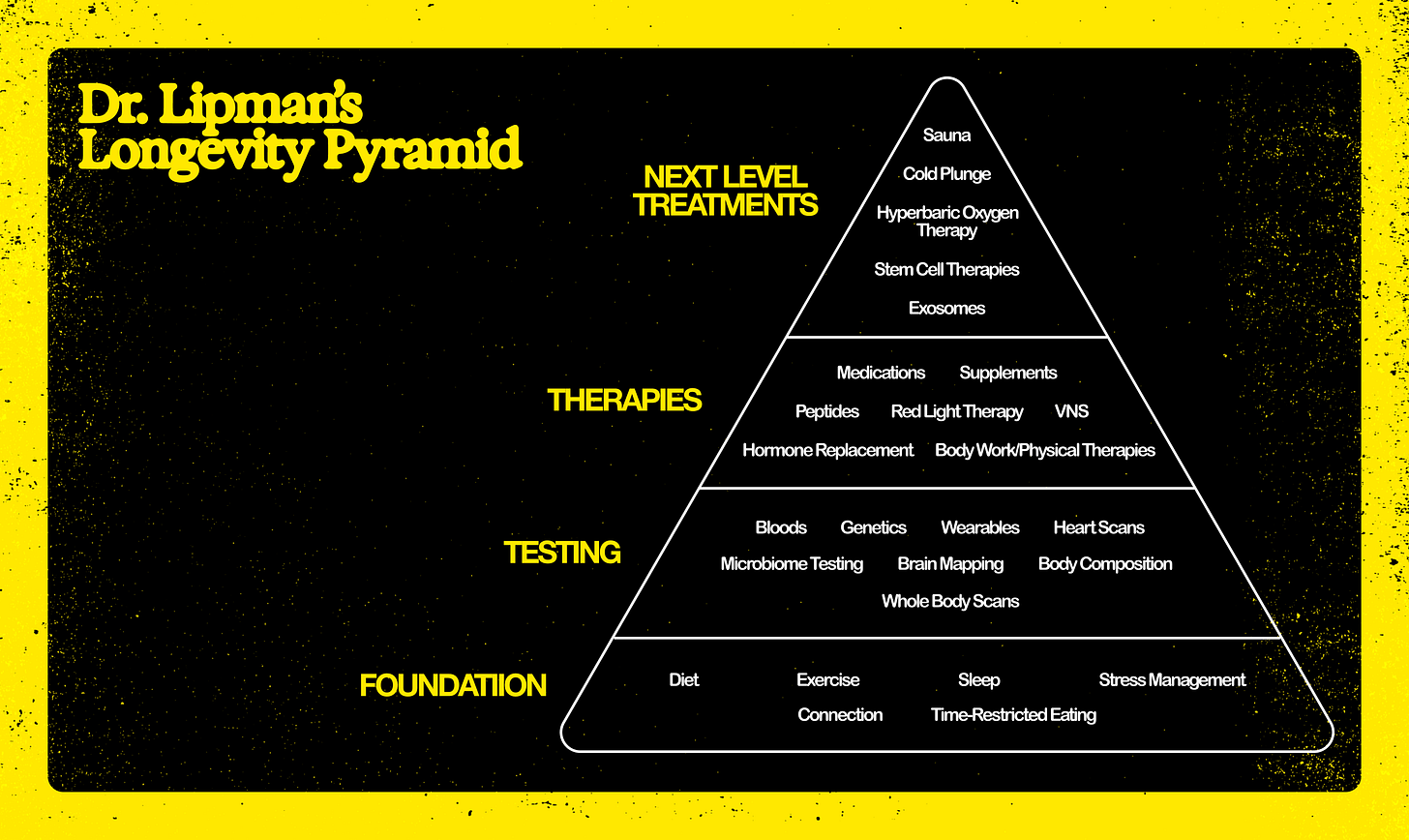 At the base are things most of us can start doing today: eating better, drinking a little (or a lot) less, sleeping properly, exercising, managing stress. Next come the tools that measure how well we’re doing: wearables, blood tests, microbiome scans. Above that sit protocols and therapies like red light, peptides, hormone support, and bodywork. At the very top are the moonshot treatments: stem cells, hyperbaric oxygen chambers, cold plunges, and exosomes, the kind of stuff that ends up in Vogue wellness spreads and Equinox black card packages.