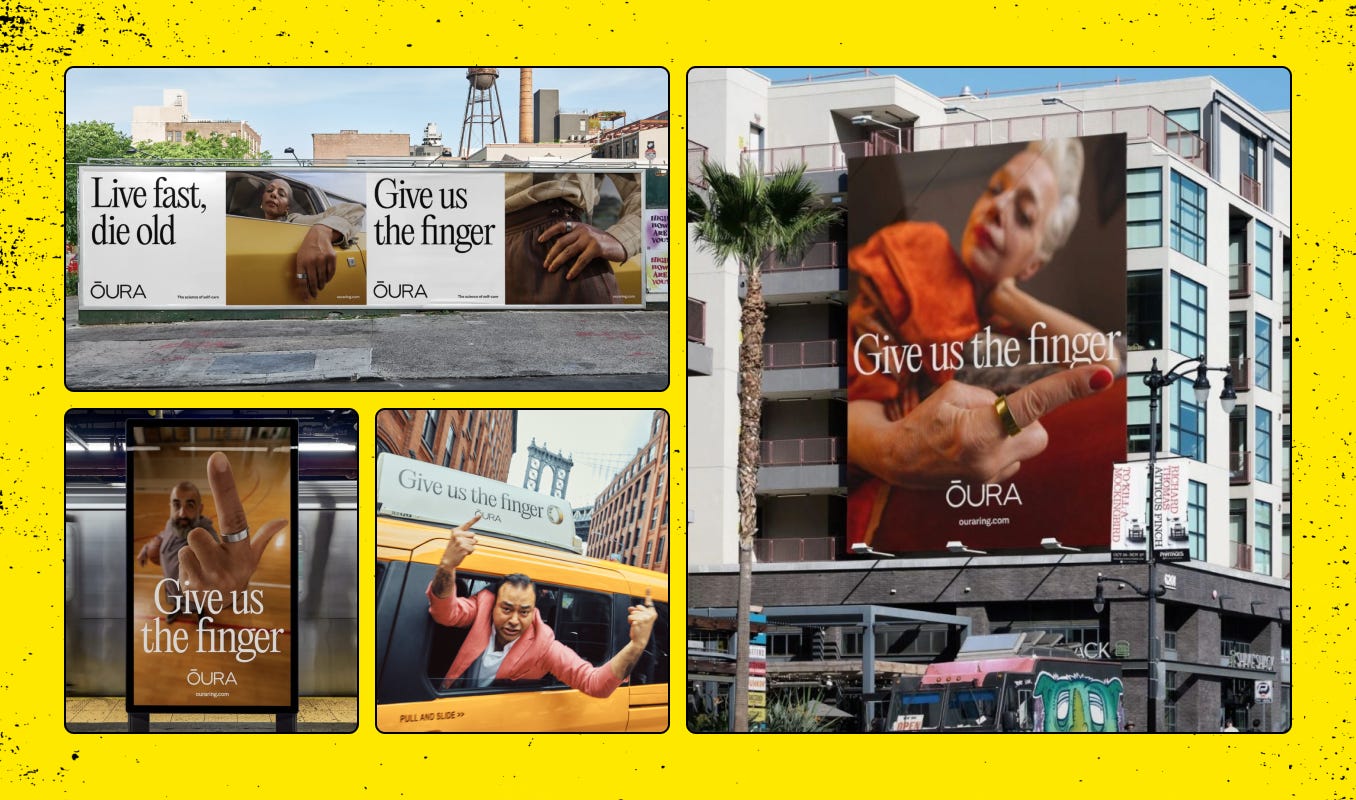 If longevity still feels like some abstract “science thing” for the rest of us mortals, brands are working hard to turn it into a culture you can buy into. The whole vibe is moving past tech-bro biohacking circles. Wearables now want to go mass — to be the kind of thing your aunt or your barista wears, even if they couldn’t name more than one biomarker (and honestly, who’s counting?). Oura is flipping the finger to old marketing tropes with its “Give Us the Finger” campaign, casting real people in their 40s through 70s as the faces of modern health.