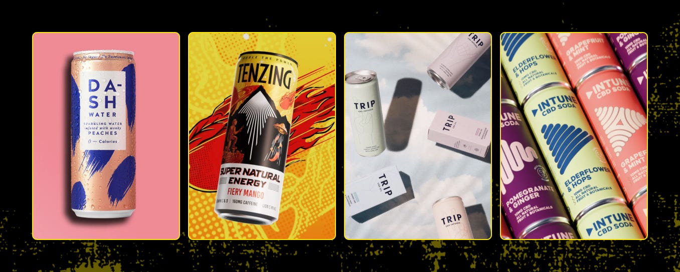 We touched on the shift from health meaning “don’t get sick”, to meaning “upgrade yourself” in the era of longevity. Walk into any corner shop and the drinks aisle looks more like a dispensary with better packaging. DASH Water’s low‑sugar “wonky fruit” cans act as a status signal, Tenzing pushes “natural energy” (as if Red Bull discovered mindfulness), and Trip or INTUNE CBD sodas promise calm in a can. Kombucha, gut-health colas, adaptogen tonics (Three Spirit, Aqua Libra) and “sleep waters” have turned into what one investor jokingly calls “pharma in a can.”