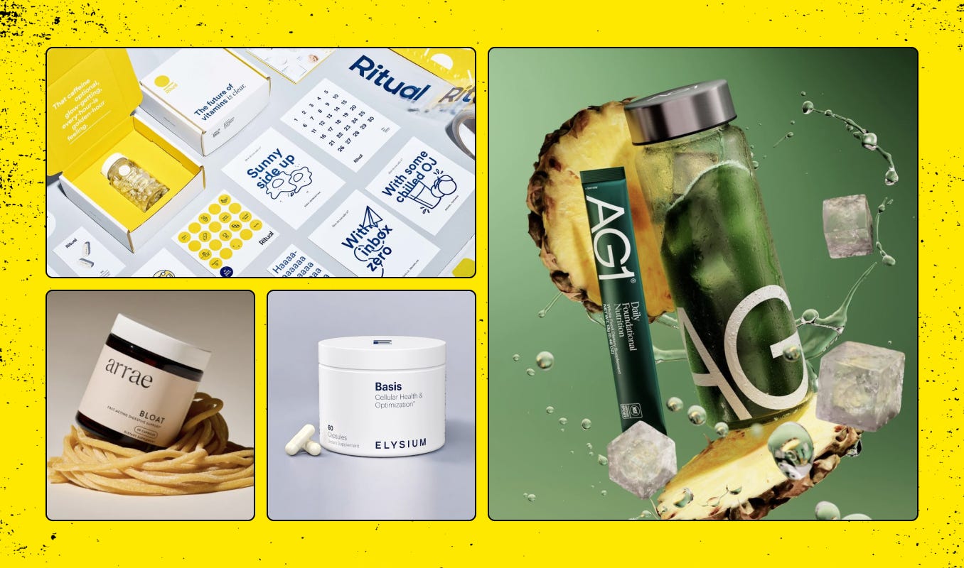 When it comes to supplements, we’ve moved on from pill-popping in silence to curated rituals with brand loyalty baked in. Athletic Greens – now AG1 – has built a direct-to-consumer empire on the promise of one daily scoop that does it all, wrapped in a premium lifestyle you actually want to show off on your counter. Ritual made vitamins cool by going full transparency mode, listing every ingredient and backing it with clinical trials (and TikToks). Arrae is tackling bloating and calm with capsules that look like Glossier, while Elysium taps longevity seekers with sleek NAD+ supplements and Nobel-linked science that reads more like a tech brand than a wellness one.